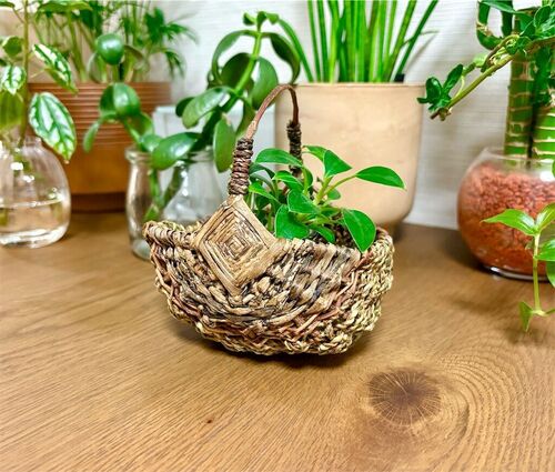 こんにちは♪ 少し前に、エノコログサ(ネコジャラシ)で編んだかごをご紹介をしましたが、そのあと余ったエノコログサで縄を作り、もう一つかごを編みました。 こちらも手のひらサイズの小さなかごです。 大まかな完成予想図を頭に浮かべながら、なんとなく…